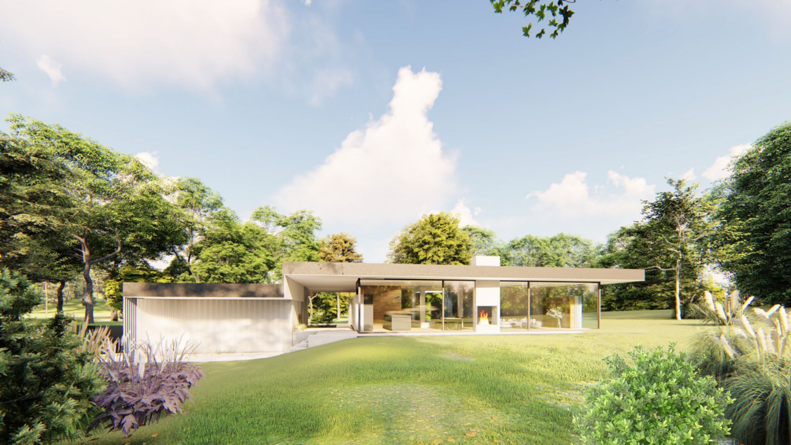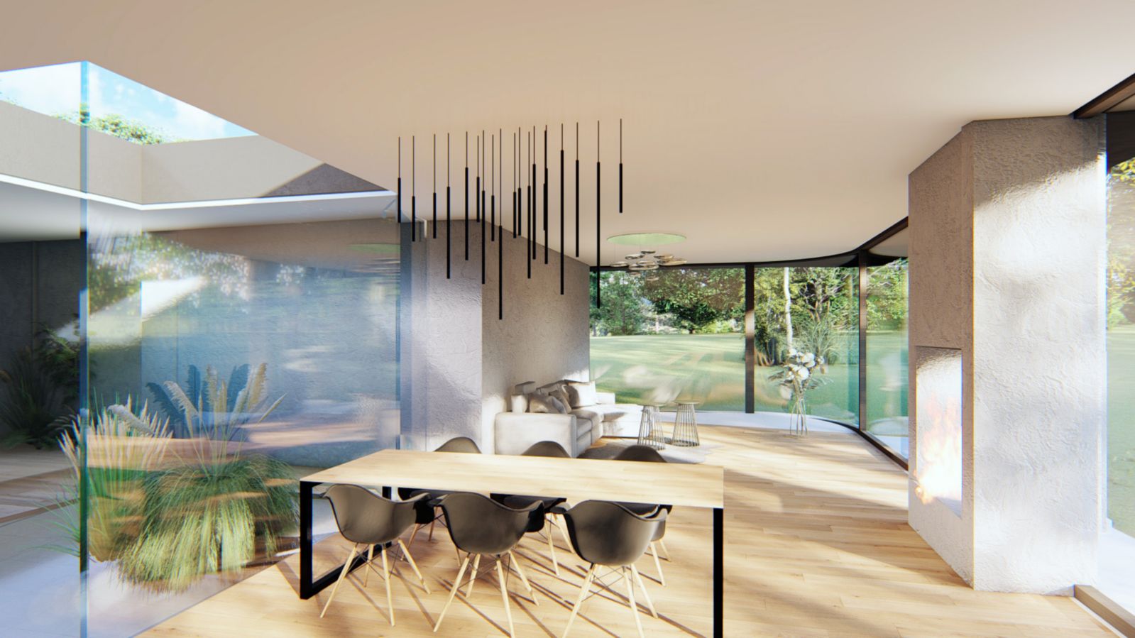 Z předsíně je vstup do haly, přes kterou se vstupuje do koupelny, tří ložnic a do obývacího pokoje, odděleného posuvnou stěnou. Mezi halou a obývacím pokojem je prosklené atrium, které přináší světlo a zeleň doprostřed dispozice. Součástí prostorného obývacího pokoje je i jídelní a kuchyňský kout. Obývací pokoj má panoramatický výhled do zahrady. Hlavní ložnice má vlastní koupelnu a šatnu.