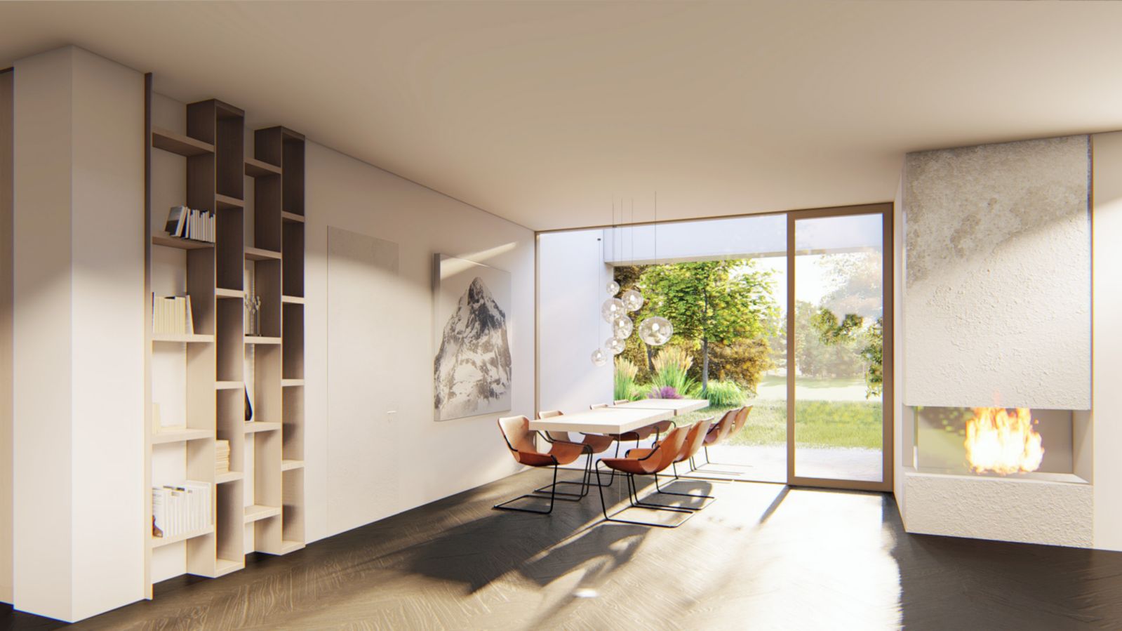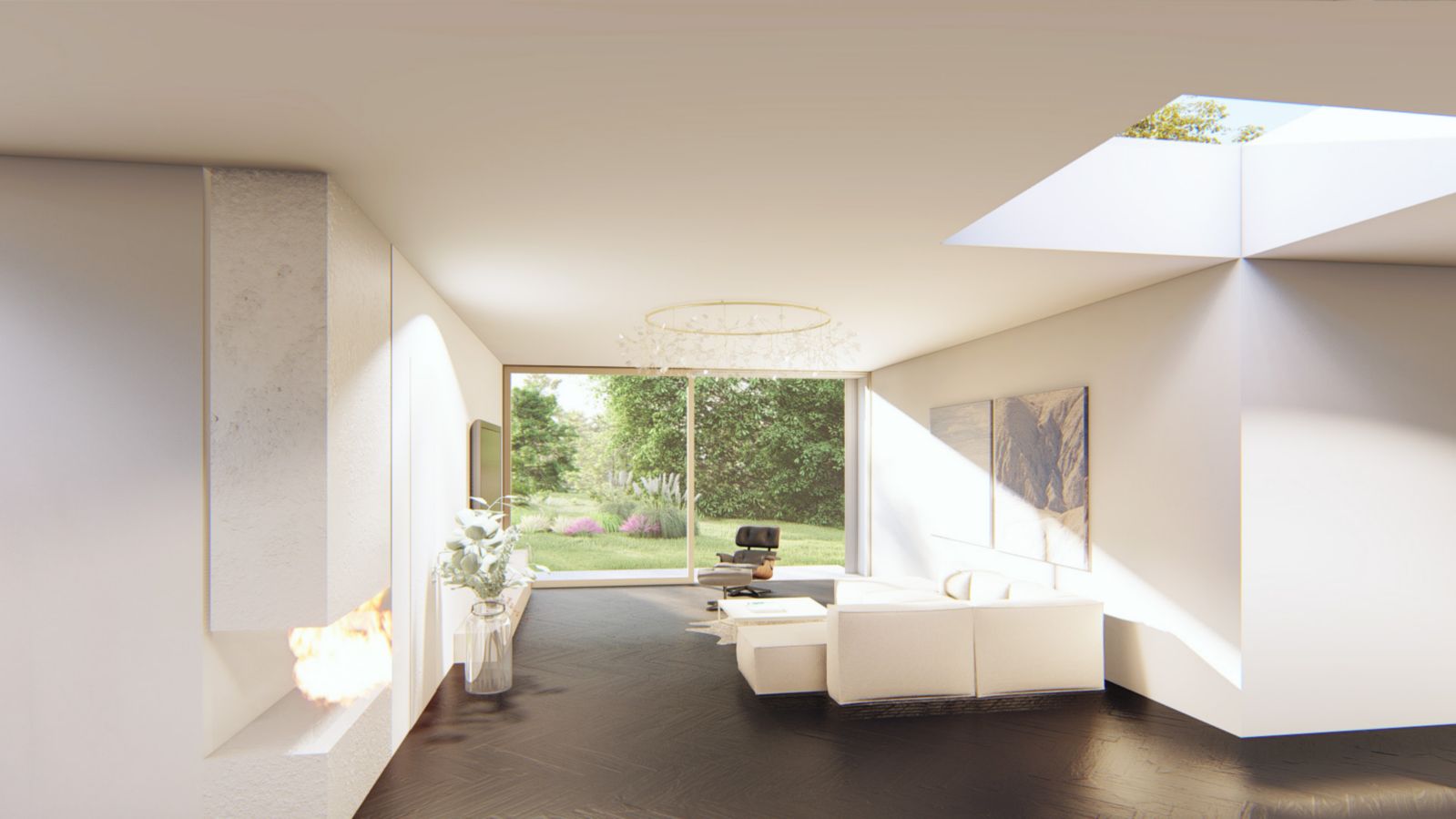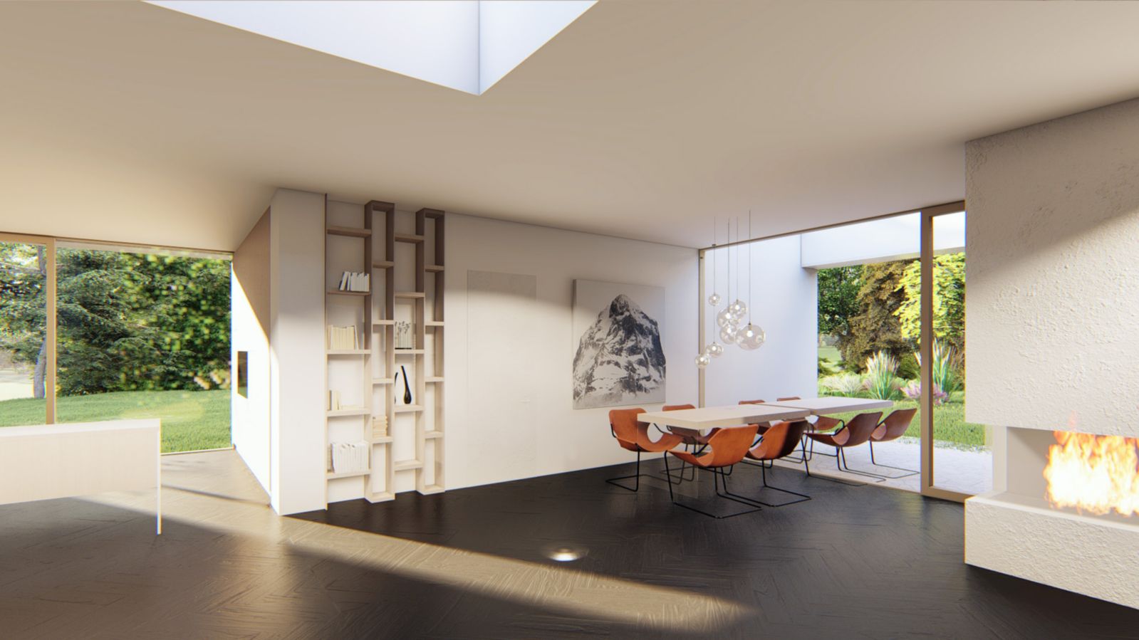 Objekt rodinného domu tvoří 4 zděné části ve čtyřech rozích čtverce. Prostor mezi nimi je vyplněný centrálním obytným prostorem - obývacím pokojem s jídelnou a kuchyní z nich každá funkce má své zákoutí uzavřené ze tří stran. Na jídelnu navazuje venkovní terasa. Z centrálního prostoru je výhled do čtyř stran a zároveň je ještě prosvětlen střešním světlíkem umístěným uprostřed dispozice. Ve třech zděných částech jsou ložnice s koupelnou a šatnou, ve čtvrté části je vstupní prostor, WC, pracovna a schodiště do suterénu, kde je umístěna garáž, technická místnost a posilovna. V objektu nejsou žádné chodby.