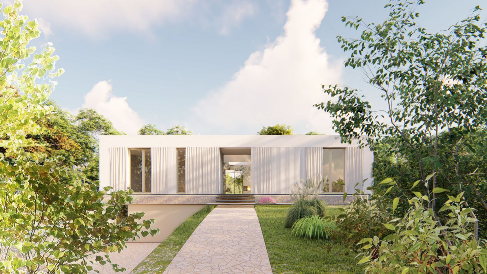 Nadzemní část domu je v kombinaci hladké bílé a reliéfní bílé fasády. Podzemní podlaží a sokl domu je obložen kamenem, který je použitý i na terase a přístupovém chodníku domu.