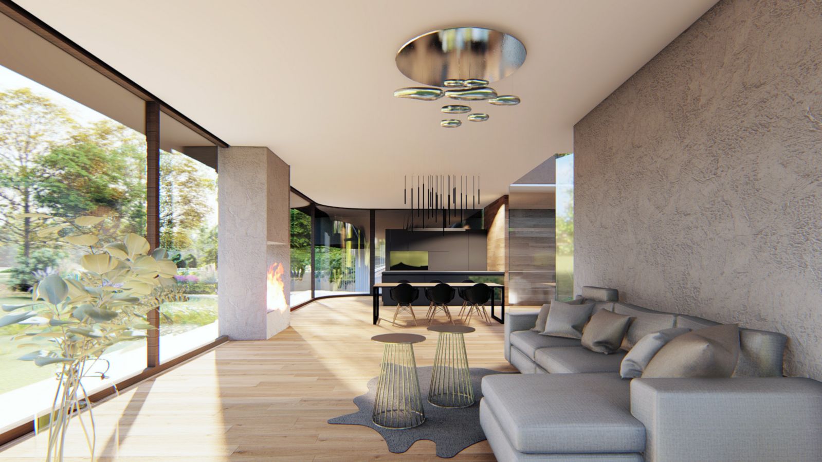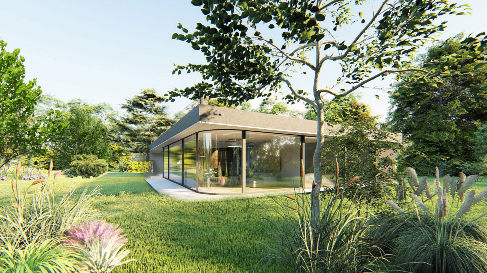 Z předsíně je vstup do haly, přes kterou se vstupuje do koupelny, tří ložnic a do obývacího pokoje, odděleného posuvnou stěnou. Mezi halou a obývacím pokojem je prosklené atrium, které přináší světlo a zeleň doprostřed dispozice. Součástí prostorného obývacího pokoje je i jídelní a kuchyňský kout. Obývací pokoj má panoramatický výhled do zahrady. Hlavní ložnice má vlastní koupelnu a šatnu.