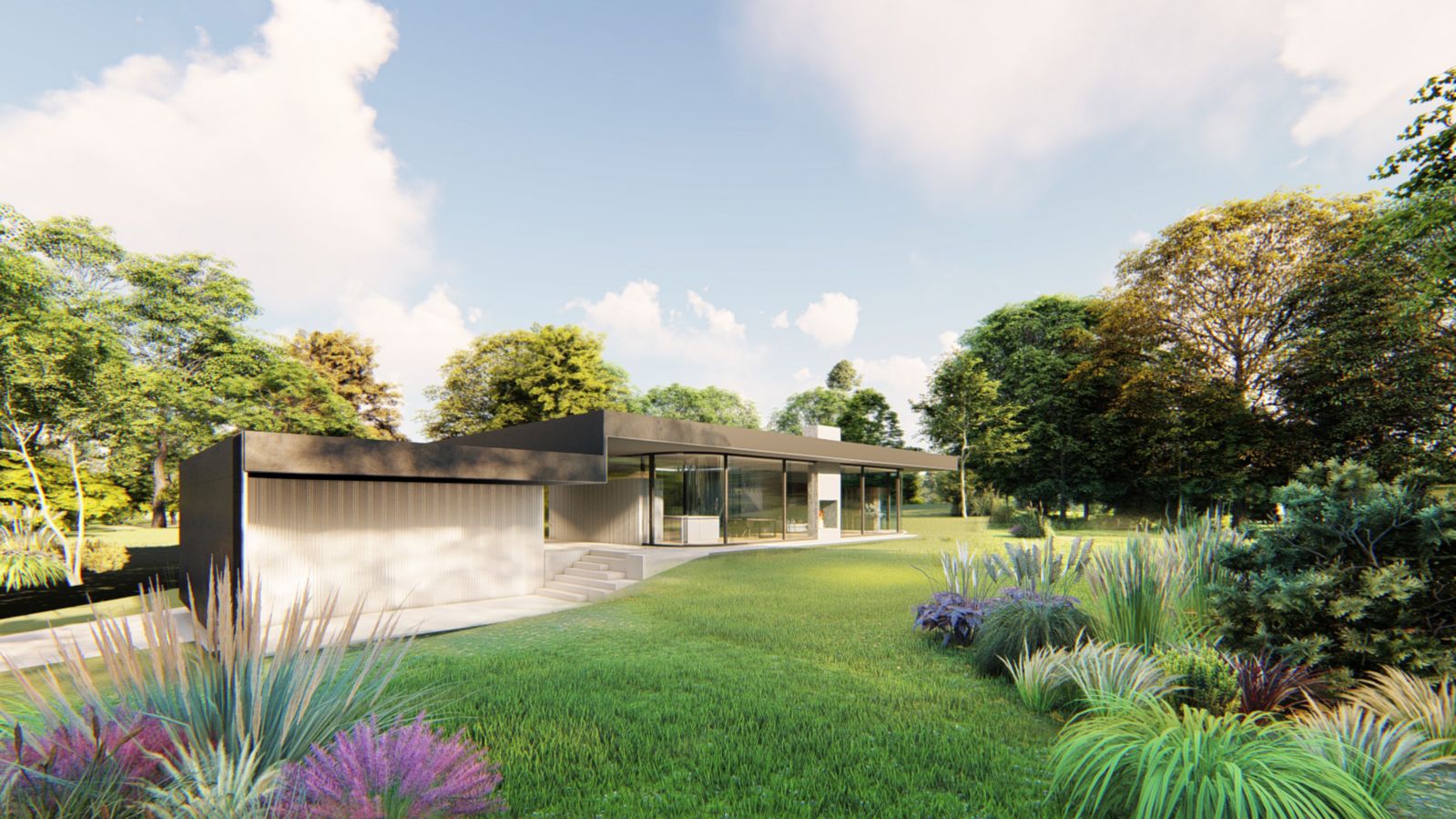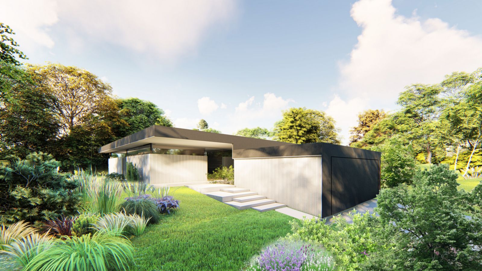 Tmavé stropní desky v antracitové stěrce kontrastují se světlou fasádou s jemným vertikálním reliéfem.