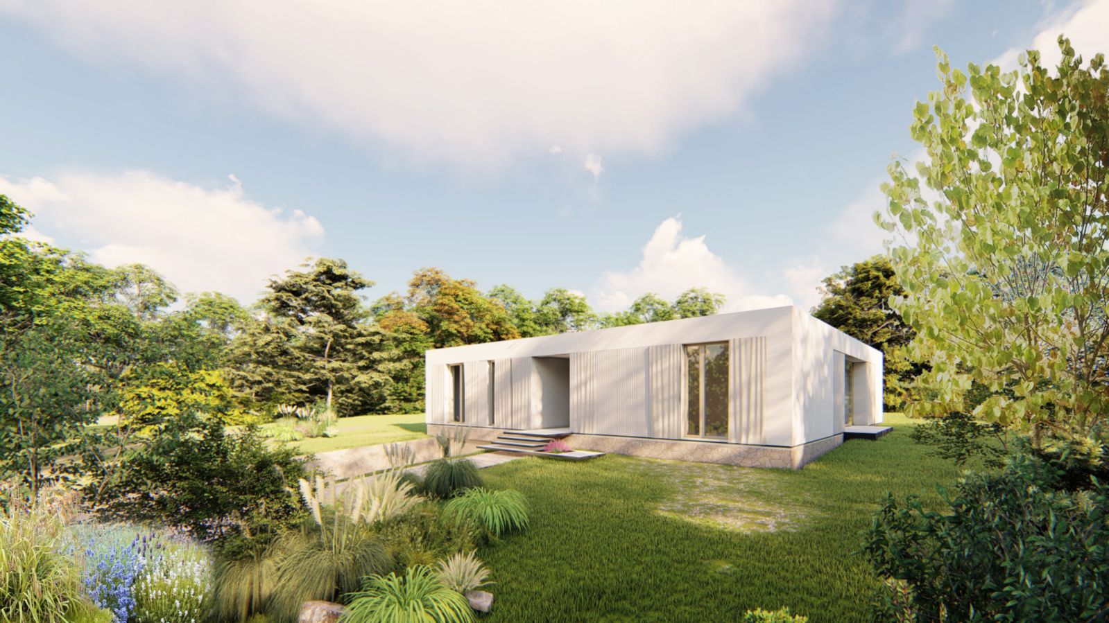 Nadzemní část domu je v kombinaci hladké bílé a reliéfní bílé fasády. Podzemní podlaží a sokl domu je obložen kamenem, který je použitý i na terase a přístupovém chodníku domu.