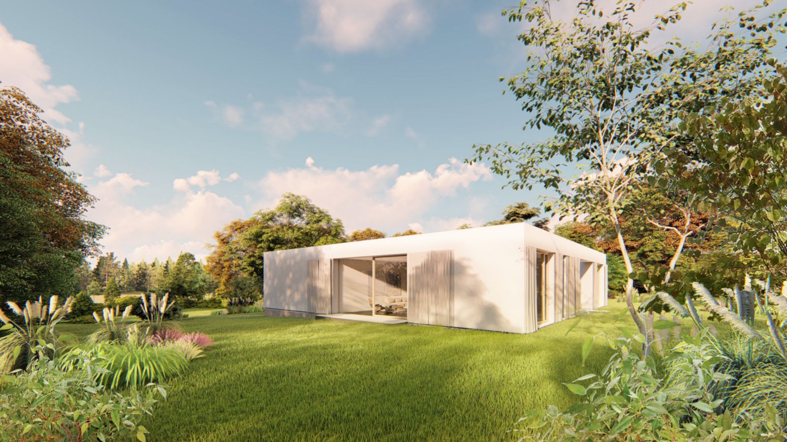 Objekt rodinného domu tvoří 4 zděné části ve čtyřech rozích čtverce. Prostor mezi nimi je vyplněný centrálním obytným prostorem - obývacím pokojem s jídelnou a kuchyní z nich každá funkce má své zákoutí uzavřené ze tří stran. Na jídelnu navazuje venkovní terasa. Z centrálního prostoru je výhled do čtyř stran a zároveň je ještě prosvětlen střešním světlíkem umístěným uprostřed dispozice. Ve třech zděných částech jsou ložnice s koupelnou a šatnou, ve čtvrté části je vstupní prostor, WC, pracovna a schodiště do suterénu, kde je umístěna garáž, technická místnost a posilovna. V objektu nejsou žádné chodby.